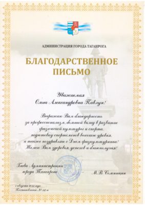 Ежегодно во вторую субботу августа отмечается День физкультурника. Своим профессиональным праздником его считают все инструкторы ДОО, тренера, учителя физкультуры, спортсмены и просто любители спорта. Поздравляем нашего замечательного, незаменимого, профессионального инструктора по физической культуре Павлун Ольгу Александровну с эти праздником и с вручением благодарственного письма от Главы Администрации города Таганрога.